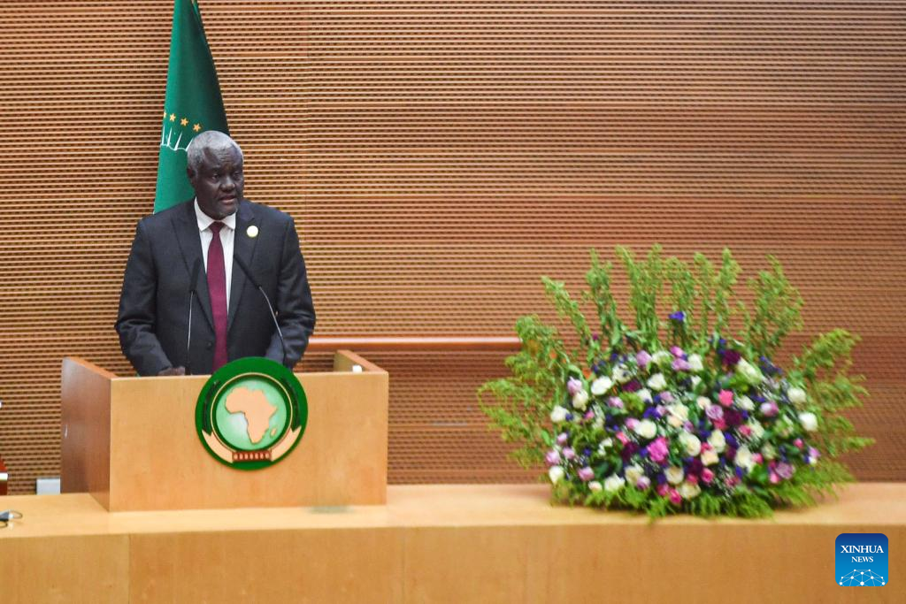 El presidente de la Comisión de la Unión Africana (UA), Moussa Faki Mahamat, pronuncia un discurso durante la 37ª Sesión Ordinaria de la Asamblea de los Jefes de Estado y de Gobierno de la UA, en Adís Abeba, Etiopía, el 17 de febrero de 2024. La 37ª Sesión Ordinaria de la Asamblea de los Jefes de Estado y de Gobierno de la Unión Africana (UA) inició el sábado en la sede de la UA en Adís Abeba, la capital de Etiopía. (Xinhua/Michael Tewelde)
