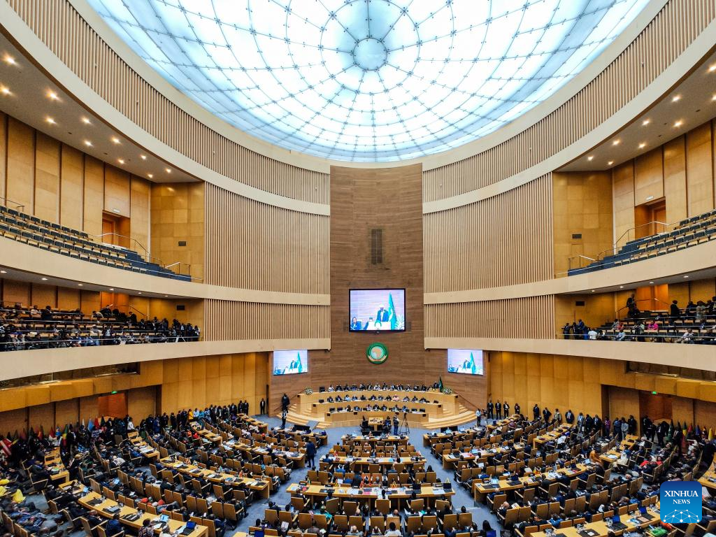 Imagen del 17 de febrero de 2024 de una vista de la 37ª Sesión Ordinaria de la Asamblea de los Jefes de Estado y de Gobierno de la Unión Africana (UA), en Adís Abeba, Etiopía. La 37ª Sesión Ordinaria de la Asamblea de los Jefes de Estado y de Gobierno de la Unión Africana (UA) inició el sábado en la sede de la UA en Adís Abeba, la capital de Etiopía. (Xinhua/Li Yahui)