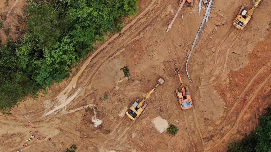Vista aérea tomada con un dron el 2 de mayo de 2024 de rescatistas y excavadoras trabajando en el sitio del derrumbe de una carretera en la autopista Meizhou-Dabu, en Meizhou, en la provincia de Guangdong, en el sur de China. El 1 de mayo, hacia las 2:10 horas de la madrugada, se registró un deslizamiento de tierras en el tramo Chayang de la autopista Meizhou-Dabu, en la ciudad de Meizhou, de la provincia de Guangdong. Hasta las 15:30 horas del 2 de mayo, el desastre había causado 48 muertos y 30 heridos. (Xinhua/Wang Ruiping)