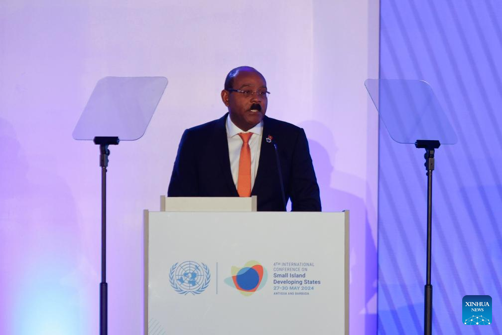 Imagen del 27 de mayo de 2024 de Gaston Browne (i-atrás), primer ministro de Antigua y Barbuda, pronunciando un discurso en la ceremonia de inauguración de la cuarta Conferencia Internacional sobre los Pequeños Estados Insulares en Desarrollo, en Saint John, capital de Antigua y Barbuda. Con el tema "Trazando el curso hacia la prosperidad responsable", la cuarta Conferencia Internacional sobre los Pequeños Estados Insulares en Desarrollo fue inaugurada el lunes en Antigua y Barbuda, con el propósito de construir resiliencia, abordar los desafíos más apremiantes del mundo y alcanzar objetivos de desarrollo sostenible. El evento, celebrado por la ONU y al que asistieron líderes mundiales, representantes del sector privado, de la sociedad civil, de la academia y jóvenes, durará cuatro días, del 27 al 30 de mayo. (Xinhua/Li Muzi)