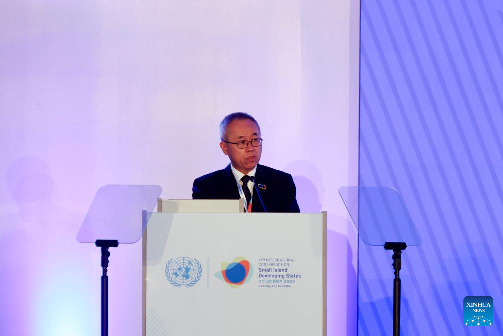 Imagen del 27 de mayo de 2024 de Li Junhua, secretario general adjunto de Asuntos Económicos y Sociales de las Naciones Unidas, pronunciando un discurso en la ceremonia de inauguración de la cuarta Conferencia Internacional sobre los Pequeños Estados Insulares en Desarrollo, en Saint John, capital de Antigua y Barbuda. Con el tema "Trazando el curso hacia la prosperidad responsable", la cuarta Conferencia Internacional sobre los Pequeños Estados Insulares en Desarrollo fue inaugurada el lunes en Antigua y Barbuda, con el propósito de construir resiliencia, abordar los desafíos más apremiantes del mundo y alcanzar objetivos de desarrollo sostenible. El evento, celebrado por la ONU y al que asistieron líderes mundiales, representantes del sector privado, de la sociedad civil, de la academia y jóvenes, durará cuatro días, del 27 al 30 de mayo. (Xinhua/Li Muzi)