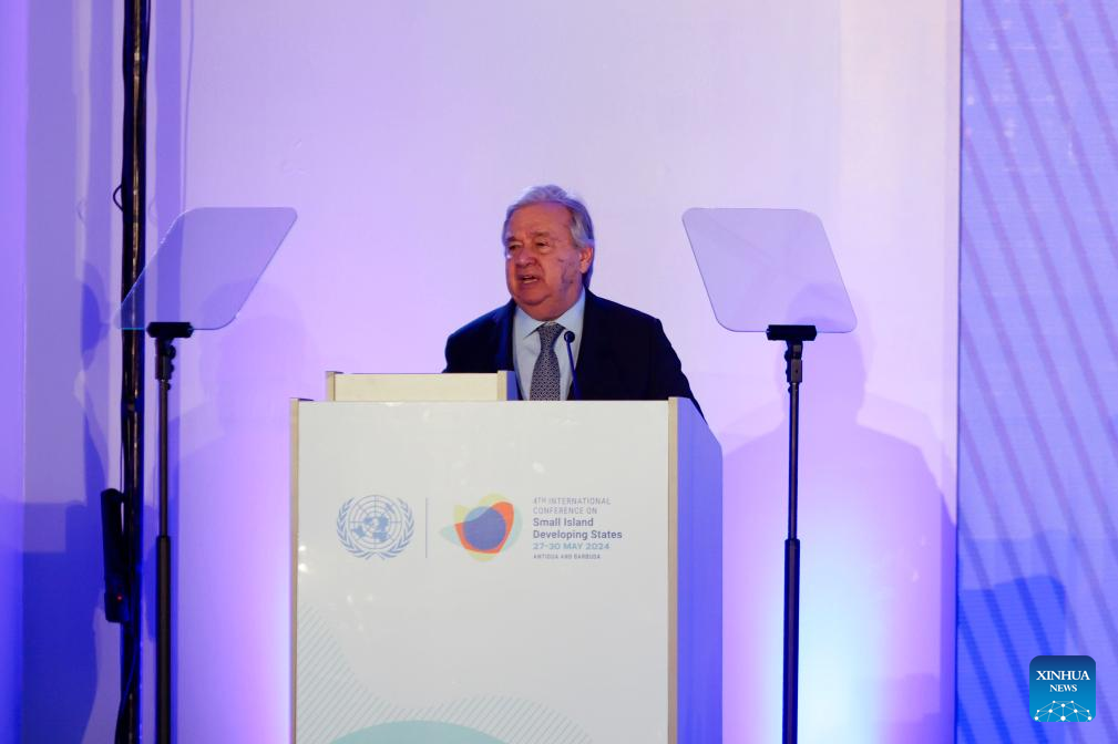 Imagen del 27 de mayo de 2024 de António Guterres, secretario general de la Organización de las Naciones Unidas (ONU), pronunciando un discurso en la ceremonia de inauguración de la cuarta Conferencia Internacional sobre los Pequeños Estados Insulares en Desarrollo, en Saint John, capital de Antigua y Barbuda. Con el tema "Trazando el curso hacia la prosperidad responsable", la cuarta Conferencia Internacional sobre los Pequeños Estados Insulares en Desarrollo fue inaugurada el lunes en Antigua y Barbuda, con el propósito de construir resiliencia, abordar los desafíos más apremiantes del mundo y alcanzar objetivos de desarrollo sostenible. El evento, celebrado por la ONU y al que asistieron líderes mundiales, representantes del sector privado, de la sociedad civil, de la academia y jóvenes, durará cuatro días, del 27 al 30 de mayo. (Xinhua/Li Muzi)