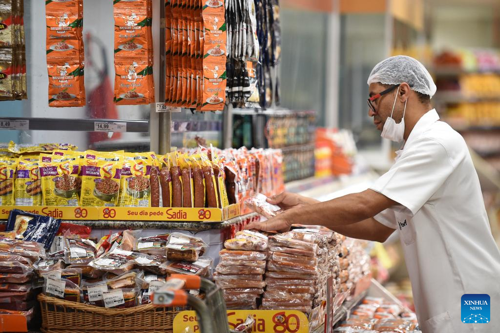BRASILIA, 10 enero, 2025 (Xinhua) -- Un trabajador acomoda productos en un supermercado, en Brasilia, Brasil, el 10 de enero de 2025. El Índice Nacional de Precios al Consumidor Amplio subió un 0,52 por ciento en diciembre y terminó el año con un acumulado de 4,83 por ciento, superando el 4,62 por ciento de 2023, de acuerdo con el informe del Instituto Brasileño de Geografía y Estadística. (Xinhua/Lucio Tavora)