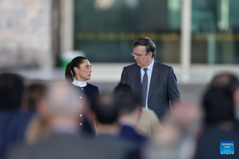 CIUDAD DE MEXICO, 13 enero, 2025 (Xinhua) -- La presidenta mexicana, Claudia Sheinbaum (i), y el secretario mexicano de Economía, Marcelo Ebrard (d), reaccionan a su llegada a la presentación del Plan México, en el Museo Nacional de Antropología, en la Ciudad de México, capital de México, el 13 de enero de 2025. (Xinhua/Francisco Cañedo)