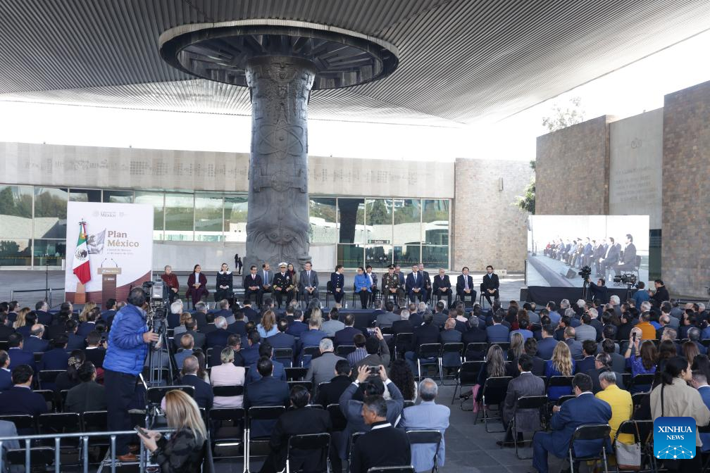 CIUDAD DE MEXICO, 13 enero, 2025 (Xinhua) -- La presidenta mexicana, Claudia Sheinbaum (c-atrás), asiste a la presentación del Plan México, en el Museo Nacional de Antropología, en la Ciudad de México, capital de México, el 13 de enero de 2025. (Xinhua/Francisco Cañedo)