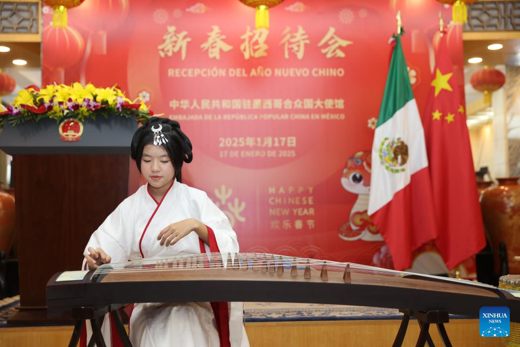 CIUDAD DE MÉXICO, 18 enero, 2025 (Xinhua) -- Imagen del 17 de enero de 2025 de una artista tocando un instrumento musical tradicional chino durante una recepción con motivo del Año Nuevo Chino 2025 en la Embajada de China en México, en la Ciudad de México, capital de México. La presidenta de la Comisión de Relaciones Exteriores Asia-Pacífico del Senado mexicano, Yeidckol Polevnsky, resaltó la visión compartida entre China y México durante una recepción con motivo del Año Nuevo Chino 2025, celebrada este viernes en la Embajada de China en México. (Xinhua/Li Mengxin)