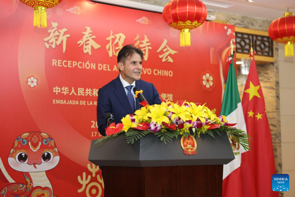 CIUDAD DE MÉXICO, 18 enero, 2025 (Xinhua) -- Imagen del 17 de enero de 2025 de Fernando González, director general para Asia-Pacífico de la Secretaría de Relaciones Exteriores de México, pronunciando un discurso durante una recepción con motivo del Año Nuevo Chino 2025 en la Embajada de China en México, en la Ciudad de México, capital de México. La presidenta de la Comisión de Relaciones Exteriores Asia-Pacífico del Senado mexicano, Yeidckol Polevnsky, resaltó la visión compartida entre China y México durante una recepción con motivo del Año Nuevo Chino 2025, celebrada este viernes en la Embajada de China en México. (Xinhua/Li Mengxin)
