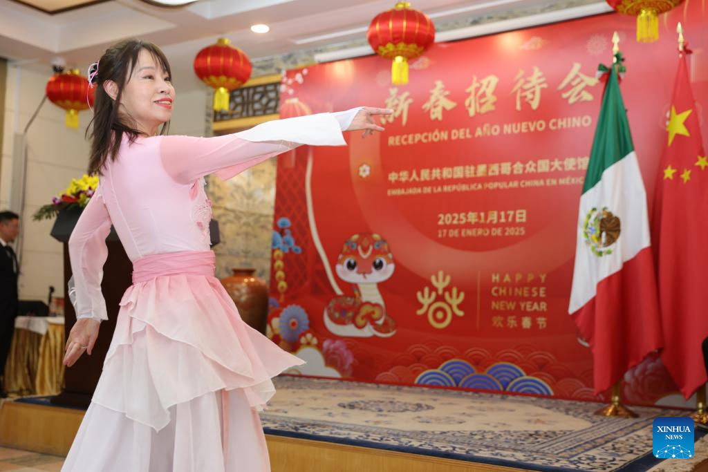 CIUDAD DE MÉXICO, 18 enero, 2025 (Xinhua) -- Imagen del 17 de enero de 2025 de una actriz bailando durante una recepción con motivo del Año Nuevo Chino 2025 en la Embajada de China en México, en la Ciudad de México, capital de México. La presidenta de la Comisión de Relaciones Exteriores Asia-Pacífico del Senado mexicano, Yeidckol Polevnsky, resaltó la visión compartida entre China y México durante una recepción con motivo del Año Nuevo Chino 2025, celebrada este viernes en la Embajada de China en México. (Xinhua/Li Mengxin)