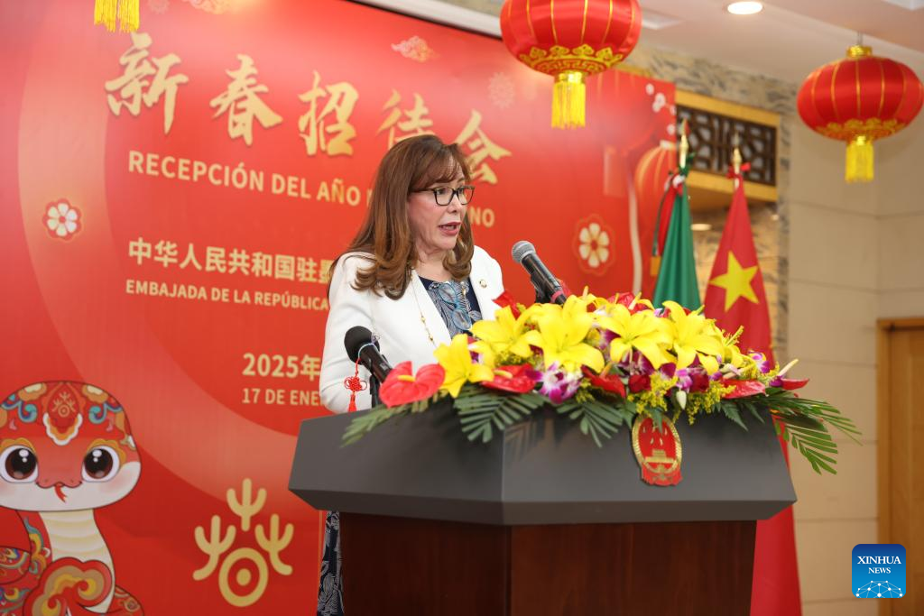 CIUDAD DE MÉXICO, 18 enero, 2025 (Xinhua) -- Imagen del 17 de enero de 2025 de la presidenta de la Comisión de Relaciones Exteriores Asia-Pacífico del Senado mexicano, Yeidckol Polevnsky, pronunciando un discurso durante una recepción con motivo del Año Nuevo Chino 2025 en la Embajada de China en México, en la Ciudad de México, capital de México. Polevnsky resaltó la visión compartida entre China y México durante una recepción con motivo del Año Nuevo Chino 2025, celebrada este viernes en la Embajada de China en México. (Xinhua/Li Mengxin)