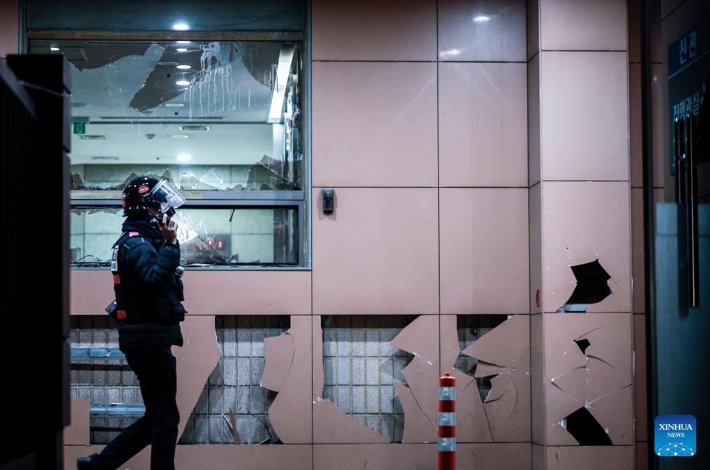 SEUL, 19 enero, 2025 (Xinhua) -- Imagen del 19 de enero de 2025 de un edificio dañado en el Tribunal de Distrito Occidental de Seúl, en Seúl, República de Corea. El Tribunal de Distrito Occidental de Seúl emitió una orden de detención contra el presidente destituido Yoon Suk-yeol en las primeras horas del domingo hora local, por su fallido intento de ley marcial. Con la orden, el período de detención de Yoon, quien fue arrestado el miércoles, se extenderá hasta por 20 días, incluido el período de arresto. Después de la aprobación de la orden, algunos seguidores de Yoon protestaron en el exterior del tribunal escalando la valla trasera del tribunal y lanzando piedras para destrozar las ventanas, en respuesta, una significativa fuerza policiaca fue desplegada para dispersar a los manifestantes. (Xinhua/NEWSIS)