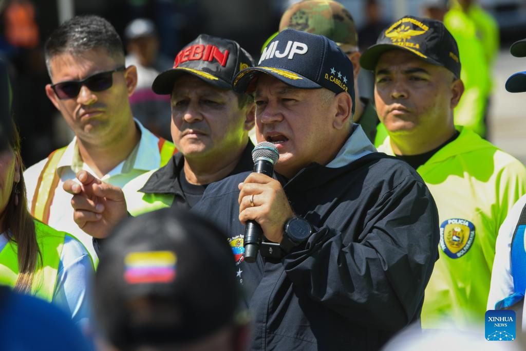 El titular del Ministerio del Poder Popular para Relaciones Interiores, Justicia y Paz de Venezuela, Diosdado Cabello, habla durante una conferencia de prensa en el Aeropuerto Internacional Simón Bolívar, en Maiquetía, en el estado de La Guaira, Venezuela, el 24 de febrero de 2025. Un total de 242 migrantes venezolanos repatriados desde México arribaron el lunes al Aeropuerto Internacional Simón Bolívar que sirve a la ciudad venezolana de Caracas, confirmó Cabello. (Xinhua/Marcos Salgado)