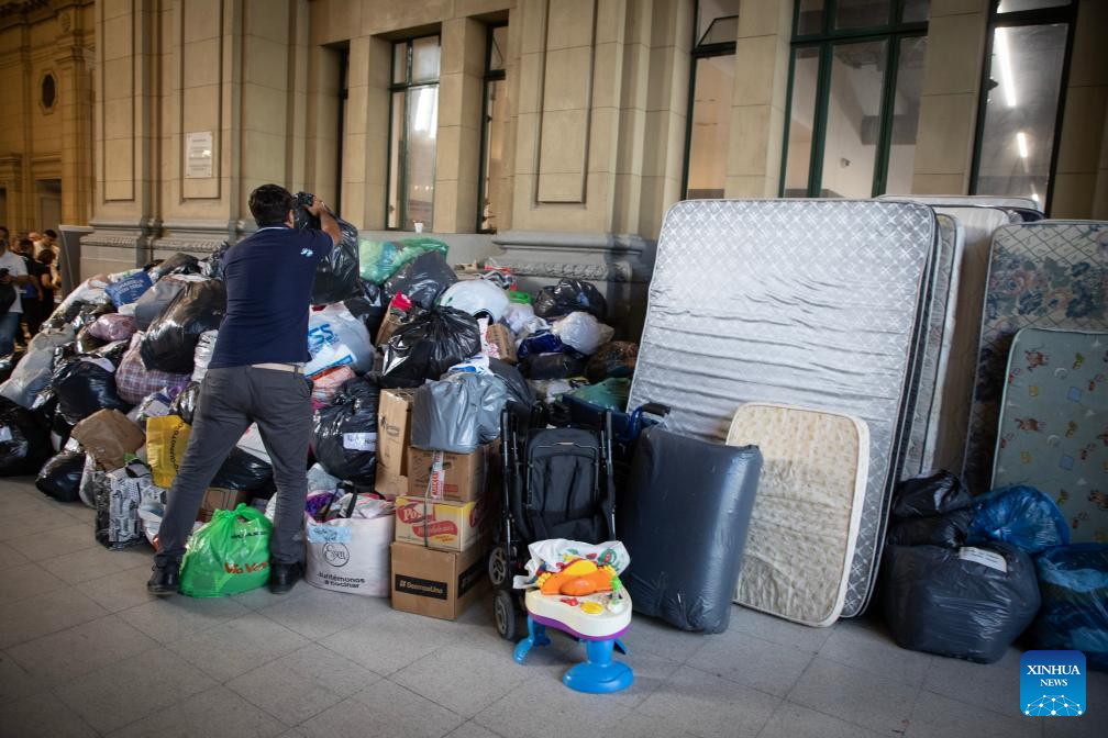 Voluntarias organizan las donaciones recibidas para ser enviadas a la ciudad de Bahía Blanca en el denominado "Tren Solidario", en la estación de trenes de Constitución, en la ciudad de Buenos Aires, capital de Argentina, el 10 de marzo de 2025. Los residentes en Argentina han apelado a la solidaridad para dar una muestra de ayuda material, pero también de afecto y contención a la ciudad de Bahía Blanca, un distrito ubicado 690 kilómetros al sudoeste de Buenos Aires (capital federal) afectado desde el 7 de marzo por lluvias e inundaciones que dejaron al menos 16 fallecidos, más de 1.400 evacuados y cuantiosos daños materiales. (Xinhua/Martín Zabala)