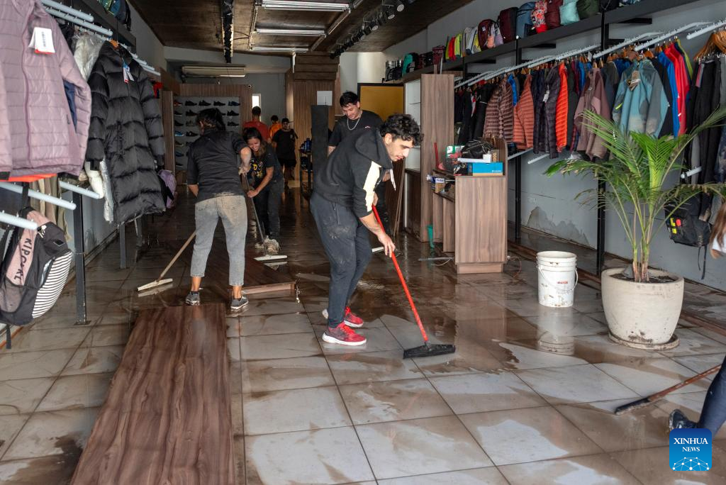 Personas limpian un local comercial de la zona del microcentro, en la ciudad de Bahía Blanca, Argentina, el 10 de marzo de 2025. El Gobierno de Argentina anunció el domingo que decretará tres días de duelo nacional por el fallecimiento de al menos 16 personas tras un feroz temporal de lluvias que azotó el viernes la ciudad argentina de Bahía Blanca, a unos 690 kilómetros al suroeste de Buenos Aires. (Xinhua/Str)