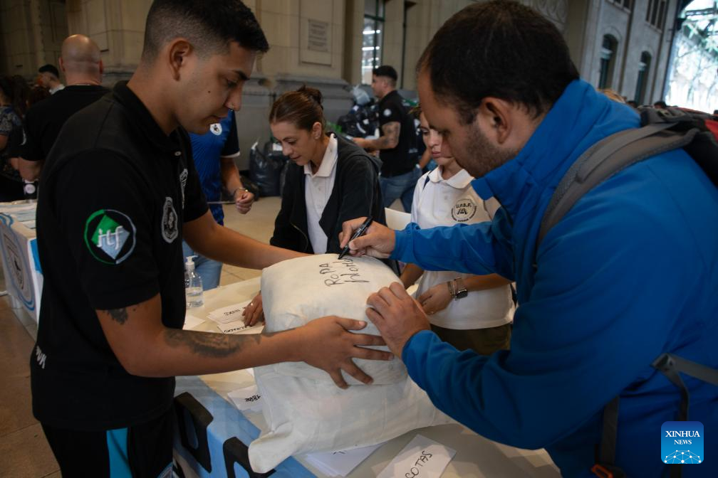 (Voluntarios reciben donaciones para ser enviadas a la ciudad de Bahía Blanca en el denominado "Tren Solidario", en la estación de trenes de Constitución, en la ciudad de Buenos Aires, capital de Argentina, el 10 de marzo de 2025. Los residentes en Argentina han apelado a la solidaridad para dar una muestra de ayuda material, pero también de afecto y contención a la ciudad de Bahía Blanca, un distrito ubicado 690 kilómetros al sudoeste de Buenos Aires (capital federal) afectado desde el 7 de marzo por lluvias e inundaciones que dejaron al menos 16 fallecidos, más de 1.400 evacuados y cuantiosos daños materiales. (Xinhua/Martín Zabala)