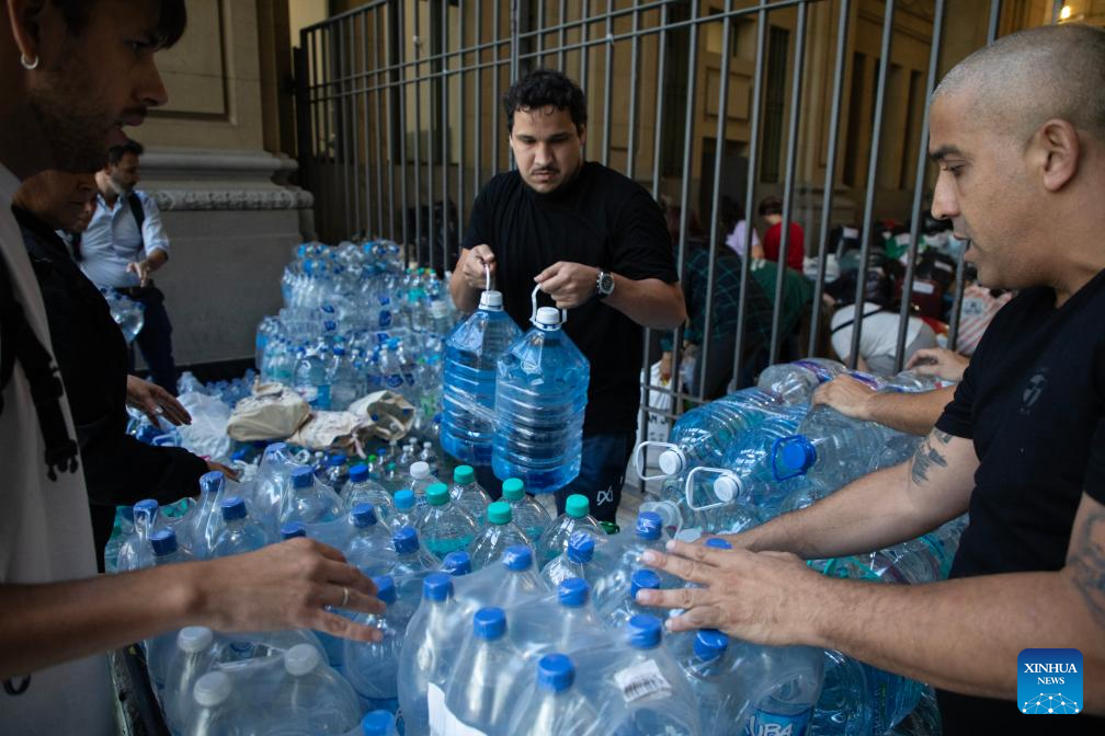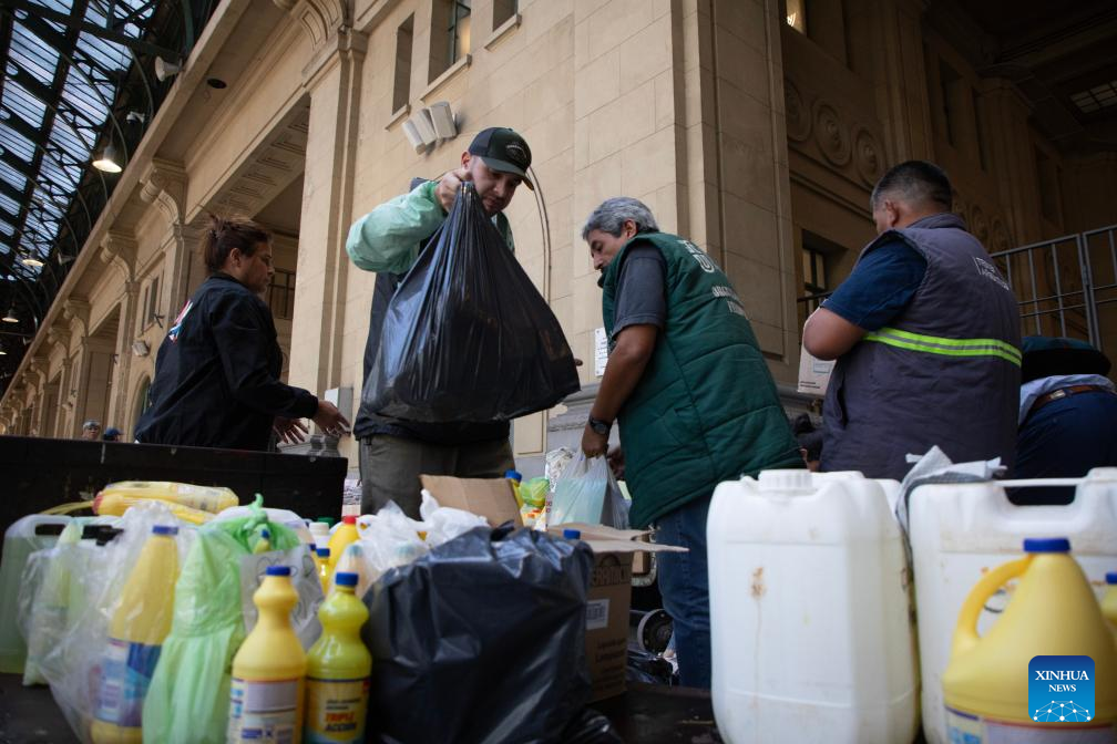 Voluntarios organizan bidones de agua potable donados para ser enviados a la ciudad de Bahía Blanca en el denominado "Tren Solidario", en la estación de trenes de Constitución, en la ciudad de Buenos Aires, capital de Argentina, el 10 de marzo de 2025. Los residentes en Argentina han apelado a la solidaridad para dar una muestra de ayuda material, pero también de afecto y contención a la ciudad de Bahía Blanca, un distrito ubicado 690 kilómetros al sudoeste de Buenos Aires (capital federal) afectado desde el 7 de marzo por lluvias e inundaciones que dejaron al menos 16 fallecidos, más de 1.400 evacuados y cuantiosos daños materiales. (Xinhua/Martín Zabala)