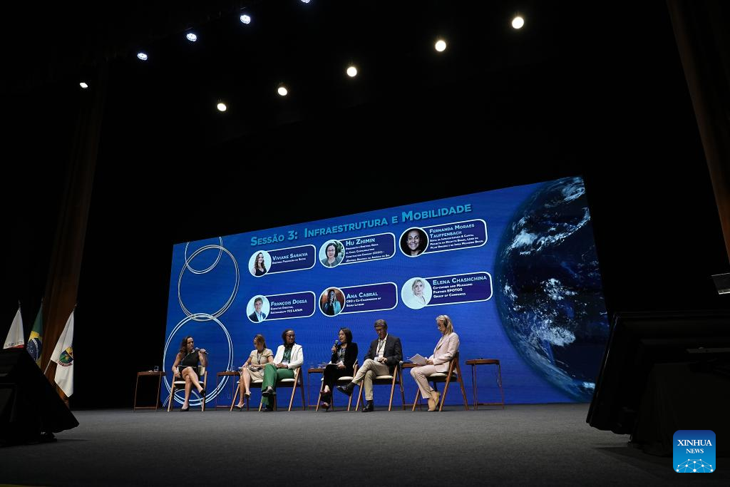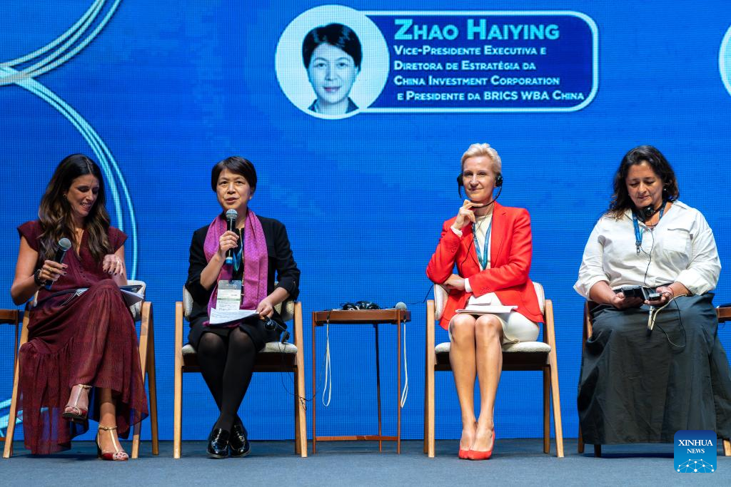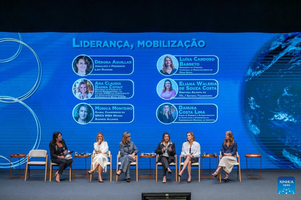 BELO HORIZONTE, 28 marzo, 2025 (Xinhua) -- Imagen del 26 de marzo de 2025 de la presidenta del capítulo chino de la Alianza Empresarial de Mujeres de los BRICS (BRICS WBA, por sus siglas en inglés), Zhao Haiying (2-i), hablando durante un panel de discusión en el WEForum, en Belo Horizonte, Brasil. El emprendimiento femenino es importante en los países BRICS, aunque todavía hay falta de oportunidades, según afirmaron los más de 1.150 participantes en el WEForum, un importante encuentro de negocios promovido por la BRICS WBA, que se concluyó el jueves en Belo Horizonte, Brasil. (Xinhua/Paulo Lopes)