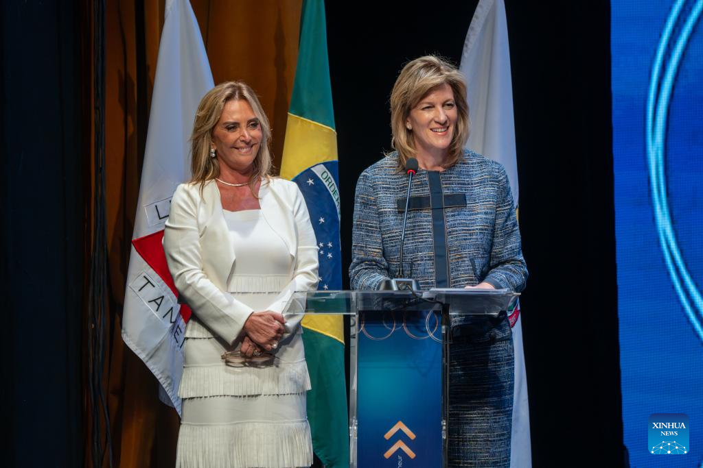 BELO HORIZONTE, 28 marzo, 2025 (Xinhua) -- Imagen del 27 de marzo de 2025 de la presidenta de la empresa regional sudamericana de la Compañía de Construcción de Comunicaciones de China, Hu Zhimin (c), hablando en el WEForum, en Belo Horizonte, Brasil. El emprendimiento femenino es importante en los países BRICS, aunque todavía hay falta de oportunidades, según afirmaron los más de 1.150 participantes en el WEForum, un importante encuentro de negocios promovido por la Alianza Empresarial de Mujeres de los BRICS (BRICS WBA, por sus siglas en inglés), que se concluyó el jueves en Belo Horizonte, Brasil. (Xinhua/Paulo Lopes)