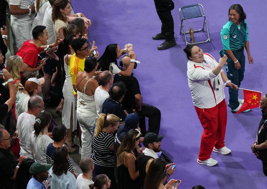 La haltera Li Wenwen de China posa para fotografías con espectadores durante la ceremonia de clausura de los Juegos Olímpicos de París 2024 en el Stade de France, en París, Francia, el 11 de agosto de 2024. (Xinhua/Zheng Huansong)