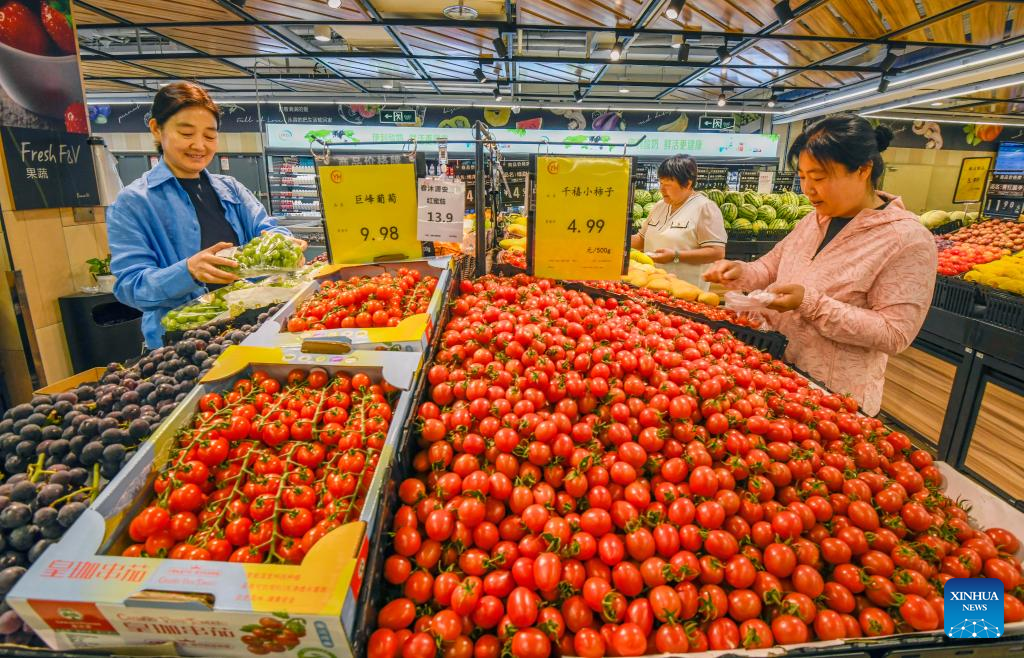 Clientas compran vegetales en un supermercado, en la ciudad de Zunhua, en la provincia de Hebei, en el norte de China, el 9 de junio de 2025. El índice de precios al consumidor (IPC) de China, uno de los principales indicadores de la inflación, registró en mayo una caída interanual del 0,1 por ciento, según datos oficiales publicados el lunes. (Xinhua/Liu Mancang)