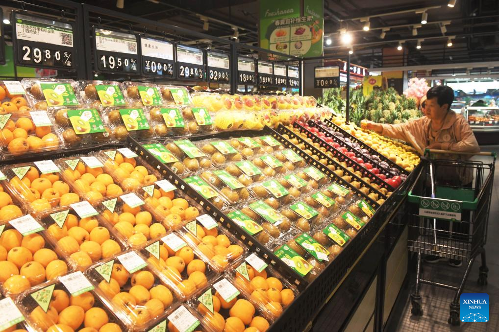 BEIJING, 9 junio, 2025 (Xinhua) -- Una clienta compra frutas en un supermercado, en Shijiazhuang, en la provincia de Hebei, en el norte de China, el 9 de junio de 2025. El índice de precios al consumidor (IPC) de China, uno de los principales indicadores de la inflación, registró en mayo una caída interanual del 0,1 por ciento, según datos oficiales publicados el lunes. (Xinhua/Jia Minjie)