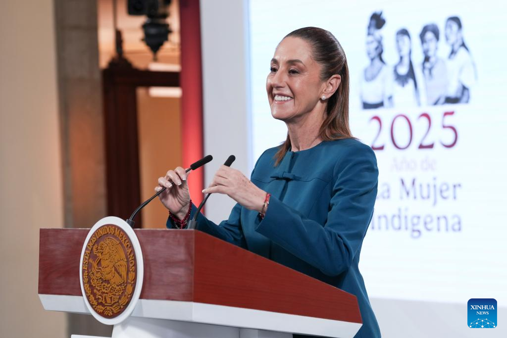 CIUDAD DE MÉXICO, 25 agosto, 2025 (Xinhua) -- Imagen proveída por la Presidencia de México de la presidenta mexicana, Claudia Sheinbaum, sonriendo durante su conferencia de prensa matutina, en Palacio Nacional, en la Ciudad de México, capital de México, el 25 de agosto de 2025. Sheinbaum informó el lunes que una delegación oficial del Gobierno de Brasil, integrada por ministros de Estado y 150 empresarios, llegará esta semana al país para reforzar los lazos económicos y promover nuevas inversiones, así como establecer vínculos entre sectores estratégicos de ambas naciones. (Xinhua/Presidencia de México)