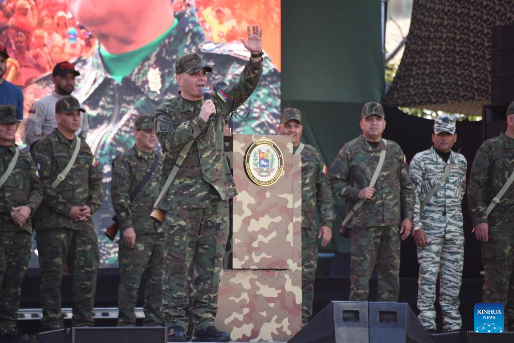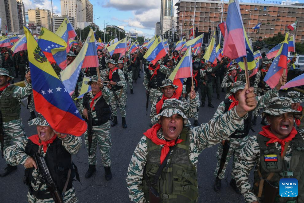 Integrantes de la Milicia Bolivariana y de la Fuerza Armada Nacional Bolivariana participan en un acto después de una marcha, en Caracas, Venezuela, el 23 de septiembre de 2025. Miles de venezolanos se movilizaron el martes por la principal arteria de Caracas, la avenida Bolívar, en una masiva demostración de respaldo al presidente venezolano, Nicolás Maduro, y en rechazo a las políticas de desestabilización que, según denuncian, son promovidas por el Gobierno de Estados Unidos. (Xinhua/Marcos Salgado)