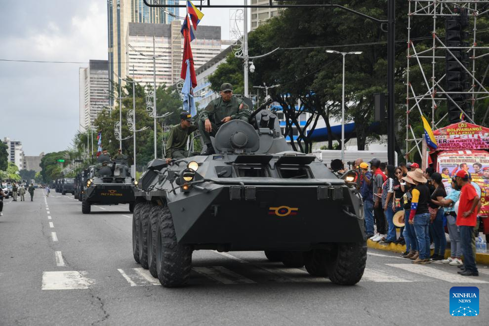 CARACAS, 23 septiembre, 2025 (Xinhua) -- Integrantes de la Fuerza Armada Nacional Bolivariana a bordo de un vehículo blindado participan en una marcha, en Caracas, Venezuela, el 23 de septiembre de 2025. Miles de venezolanos se movilizaron el martes por la principal arteria de Caracas, la avenida Bolívar, en una masiva demostración de respaldo al presidente venezolano, Nicolás Maduro, y en rechazo a las políticas de desestabilización que, según denuncian, son promovidas por el Gobierno de Estados Unidos. (Xinhua/Marcos Salgado)