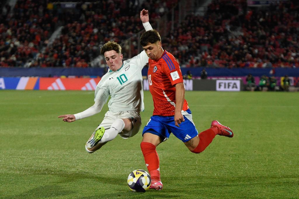 SANTIAGO, 28 septiembre, 2025 (Xinhua) -- Imagen del 27 de septiembre de 2025 de Nathan Walker (i), de Nueva Zelanda, disputando el balón con Rodrigo Godoy, de Chile, durante el partido correspondiente al Grupo A de la Copa Mundial Sub-20 de la FIFA Chile 2025, en Santiago, Chile. (Xinhua/Jorge Villegas)