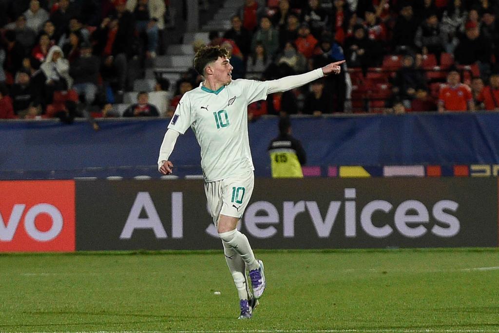 SANTIAGO, 28 septiembre, 2025 (Xinhua) -- Imagen del 27 de septiembre de 2025 de Lautaro Millán, de Chile, festejando su anotación, durante el partido correspondiente al Grupo A entre Chile y Nueva Zelanda de la Copa Mundial Sub-20 de la FIFA Chile 2025, en Santiago, Chile. (Xinhua/Jorge Villegas)