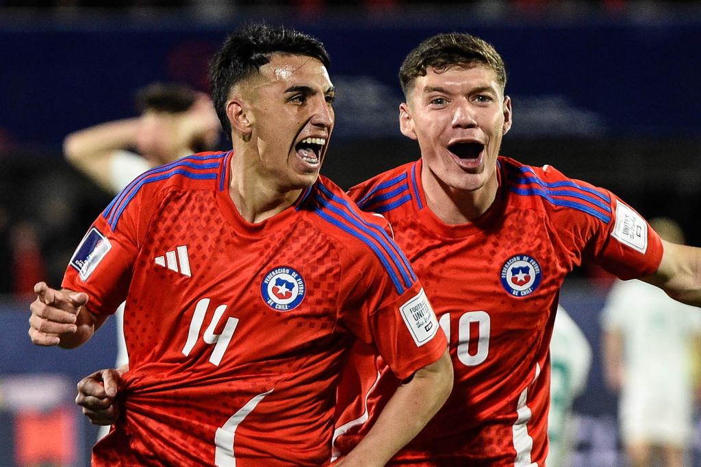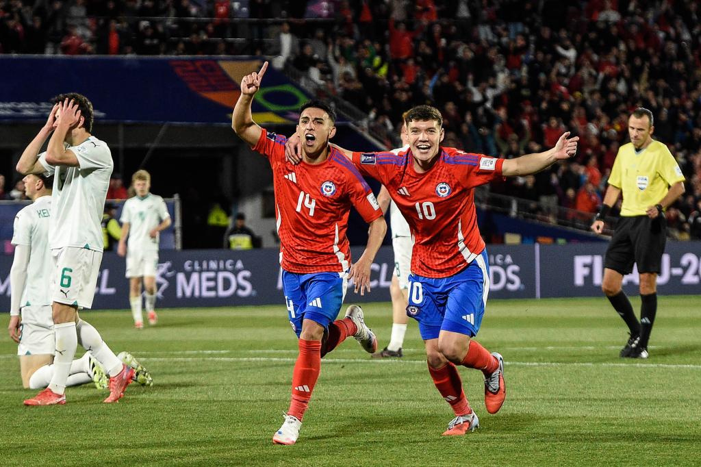 SANTIAGO, 28 septiembre, 2025 (Xinhua) -- Imagen del 27 de septiembre de 2025 de Lautaro Millán (i-frente), de Chile, festejando su anotación junto a su compañero Agustín Arce, durante el partido correspondiente al Grupo A entre Chile y Nueva Zelanda de la Copa Mundial Sub-20 de la FIFA Chile 2025, en Santiago, Chile. (Xinhua/Jorge Villegas)