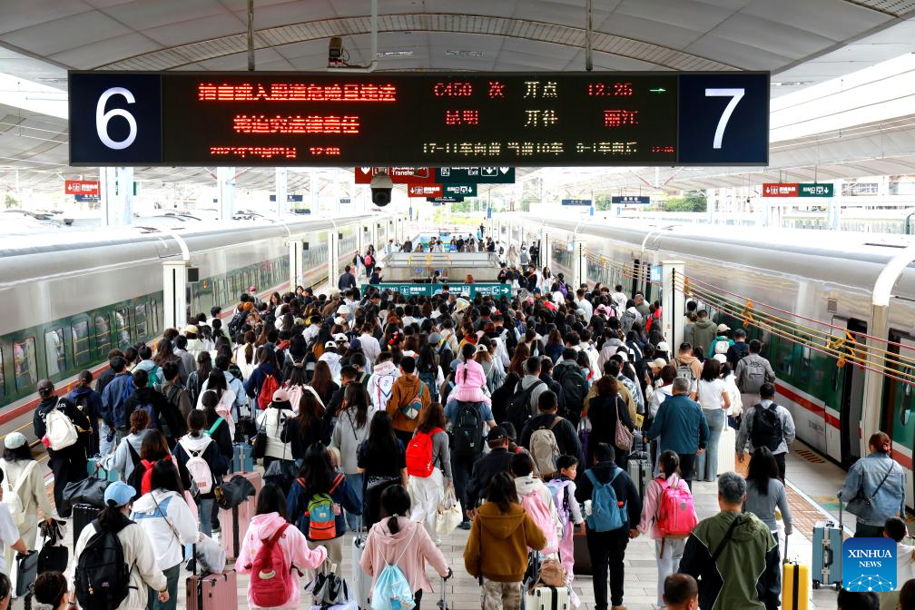 BEIJING, 1 octubre, 2025 (Xinhua) -- Pasajeros son vistos en la Estación de Ferrocarriles de Kunming, en Kunming, en la provincia de Yunnan, en el suroeste de China, el 1 de octubre de 2025. La red de transporte del país registró una temporada alta de viajes el primer día por las vacaciones del Día Nacional. (Xinhua/Zheng Yi)