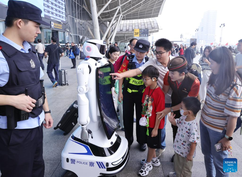 BEIJING, 1 octubre, 2025 (Xinhua) -- Niños interactúan con un robot en la Estación de Ferrocarriles de Wuhan, en Wuhan, en la provincia de Hubei, en el centro de China, el 1 de octubre de 2025. La red de transporte del país registró una temporada alta de viajes el primer día por las vacaciones del Día Nacional. (Xinhua/Zhao Jun)