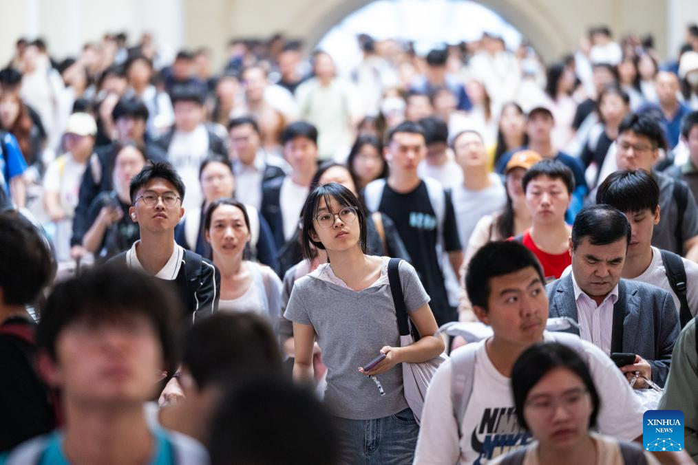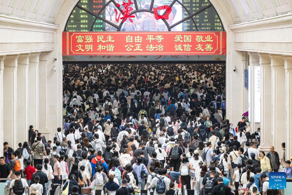 BEIJING, 1 octubre, 2025 (Xinhua) -- Pasajeros ingresan a la Estación de Ferrocarriles de Hankou, en Wuhan, en la provincia de Hubei, en el centro de China, el 1 de octubre de 2025. La red de transporte del país registró una temporada alta de viajes el primer día por las vacaciones del Día Nacional. (Xinhua/Xiao Yijiu)