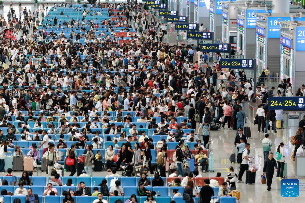 BEIJING, 1 octubre, 2025 (Xinhua) -- Pasajeros esperan por sus trenes en la Estación de Ferrocarriles de Guiyangbei, en Guiyang, en la provincia de Guizhou, en el suroeste de China, el 1 de octubre de 2025. La red de transporte del país registró una temporada alta de viajes el primer día por las vacaciones del Día Nacional. (Xinhua/Liu Xu)