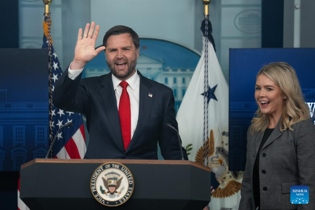 WASHINGTON, 1 octubre, 2025 (Xinhua) -- El vicepresidente de Estados Unidos, JD Vance (i), junto a la secretaria de Prensa de la Casa Blanca, Karoline Leavitt, saluda después de hablar con los reporteros, en la Casa Blanca, en Washington, D.C., Estados Unidos, el 1 de octubre de 2025. Vance advirtió el miércoles que un cierre prolongado del Gobierno federal conducirá a despidos y culpó a los demócratas por el actual estancamiento. (Xinhua/Hu Yousong)