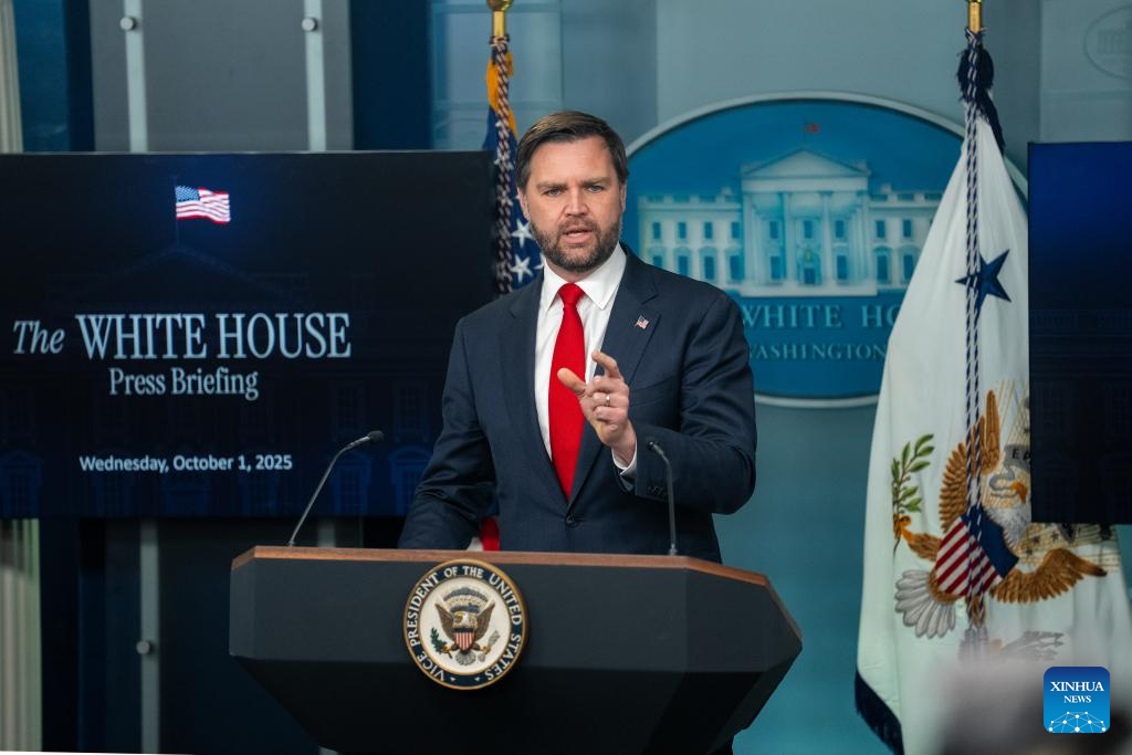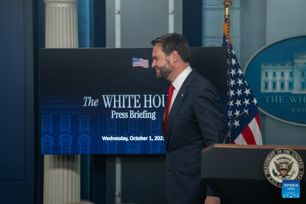 WASHINGTON, 1 octubre, 2025 (Xinhua) -- El vicepresidente de Estados Unidos, JD Vance, habla con reporteros durante una conferencia de prensa, en la Casa Blanca, en Washington, D.C., Estados Unidos, el 1 de octubre de 2025. Vance advirtió el miércoles que un cierre prolongado del Gobierno federal conducirá a despidos y culpó a los demócratas por el actual estancamiento. (Xinhua/Hu Yousong)