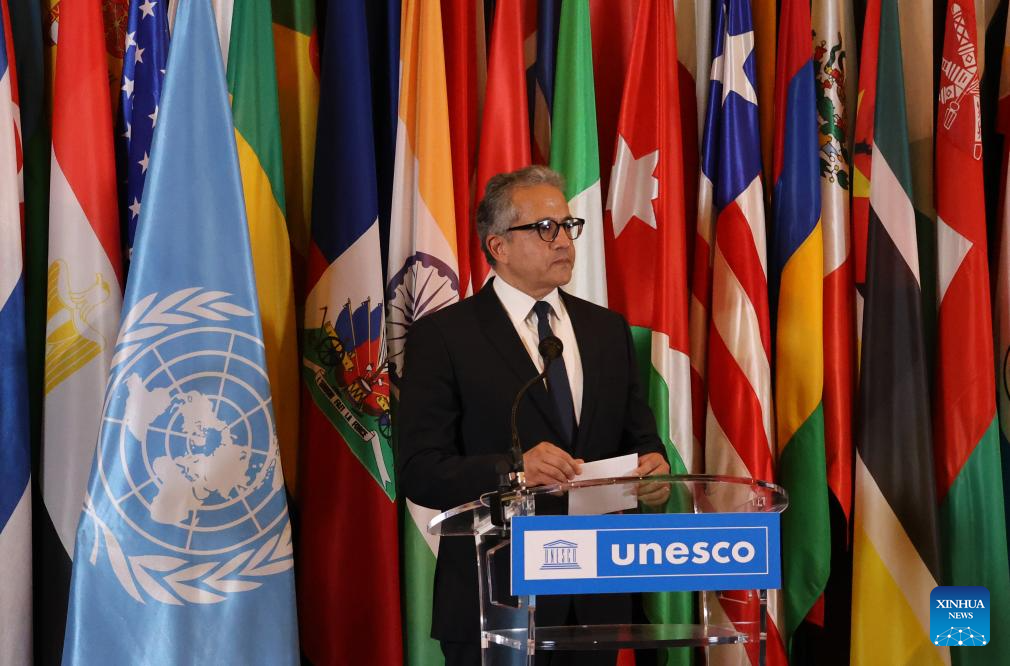El exministro egipcio de Turismo y Antigüedades, Khaled Ahmed El-Enany Ali Ezz, habla después de ganar la elección del candidato para el cargo de director general de la Unesco, en París, Francia, el 6 de octubre de 2025. El-Enany fue nominado como el único candidato para el cargo de director general de la Unesco durante la 222ª sesión del Consejo Ejecutivo de la organización, celebrada el lunes en París. (Xinhua/Zhang Baihui)