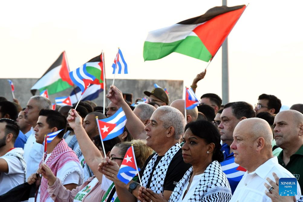 Las palabras de los oradores fueron apoyadas por la multitud que colmó un largo tramo del emblemático malecón de La Habana, donde se alzaron carteles, banderas y los tradicionales pañuelos palestinos, en una jornada en que también se realizaron en todo el país caribeño actividades de solidaridad con Palestina.