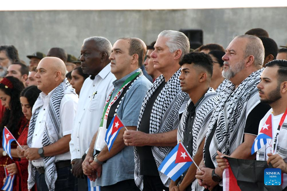 LA HABANA, 9 oct (Xinhua) -- Miles de cubanos se movilizaron hoy jueves en la ciudad de La Habana en favor de la causa palestina y contra el genocidio de Israel en la Franja de Gaza, en Medio Oriente.
