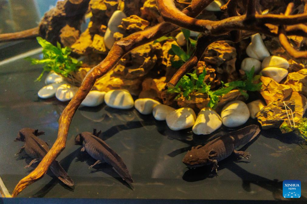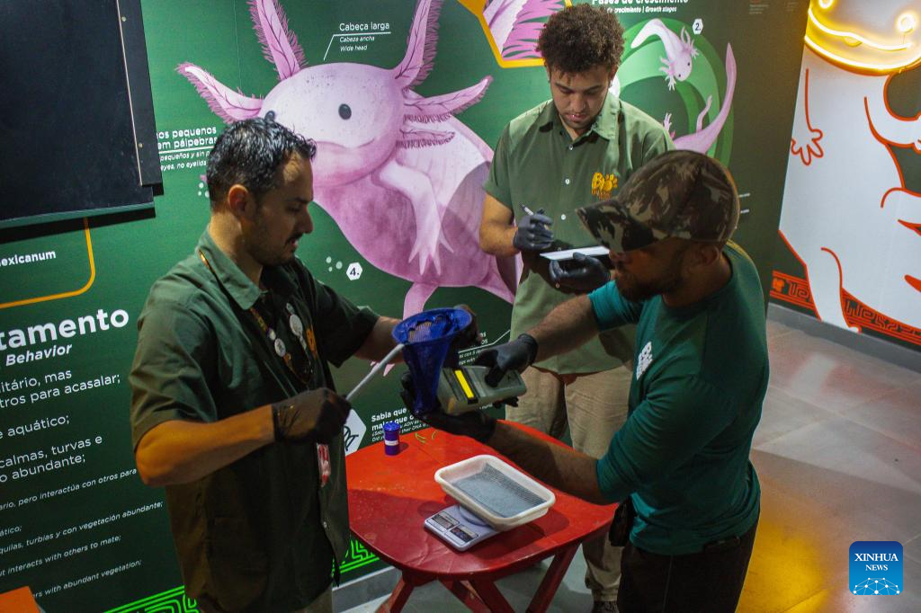 RIO DE JANEIRO, 9 octubre, 2025 (Xinhua) -- Imagen del 8 de octubre de 2025 de un técnico inspeccionando el nuevo tanque de ajolotes en el BioParque do Rio, en Río de Janeiro, Brasil. En los últimos días, se abrió al público la recién inaugurada área de exhibición de ajolotes en el BioParque do Rio, con 22 ejemplares, incluyendo 8 rescatados durante operativos contra el tráfico de fauna silvestre. (Xinhua/Claudia Martini)