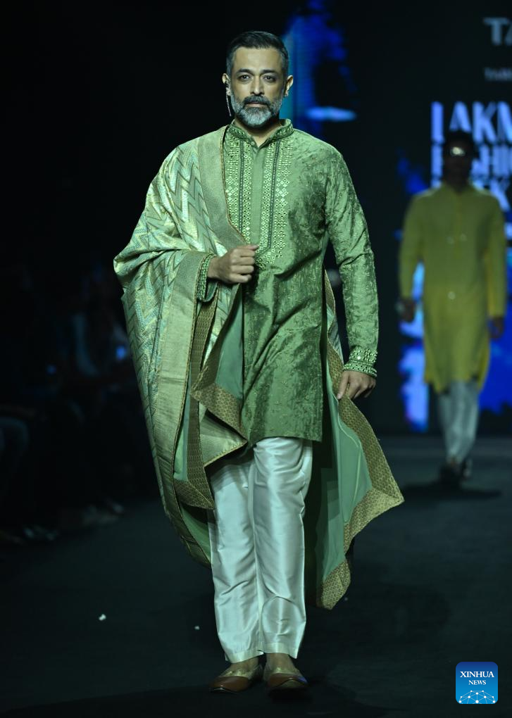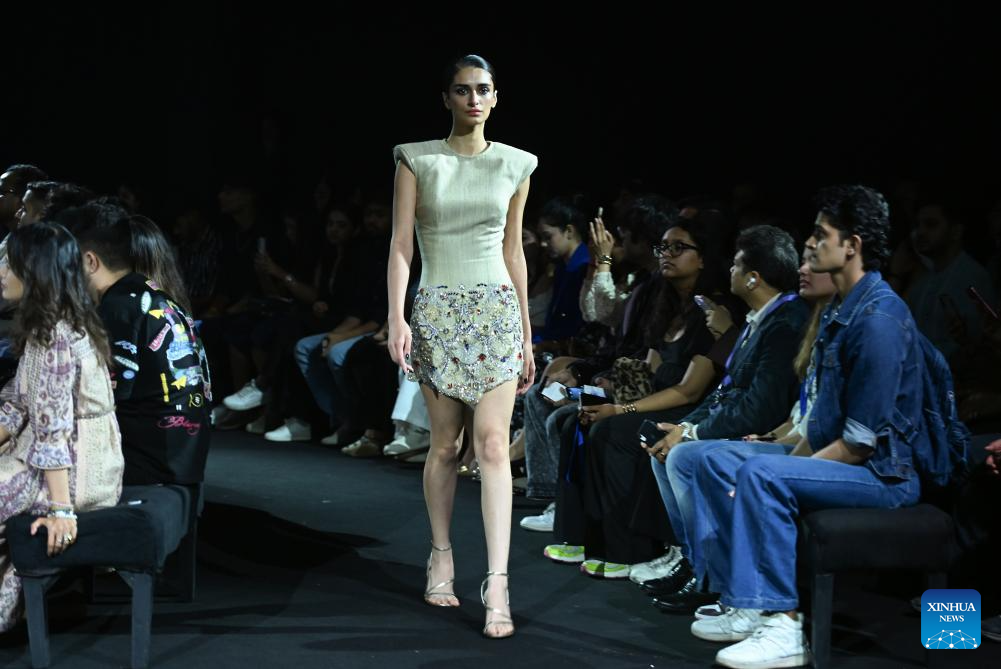 NUEVA DELHI, 10 octubre, 2025 (Xinhua) -- Un modelo presenta una creación de la marca india Tasva durante la Semana de la Moda Lakme x FDCI, en Nueva Delhi, India, el 10 de octubre de 2025. (Xinhua/Javed Dar)