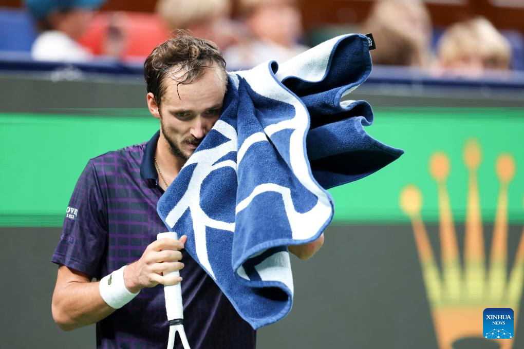 SHANGHAI, 10 octubre, 2025 (Xinhua) -- Daniil Medvedev se limpia durante los cuartos de final de individuales masculinos entre Daniil Medvedev, de Rusia, y Alex de Minaur, de Australia, en el torneo de tenis Masters de Shanghai del ATP World Tour, en Shanghai, en el este de China, el 10 de octubre de 2025. (Xinhua/Wang Xiang)