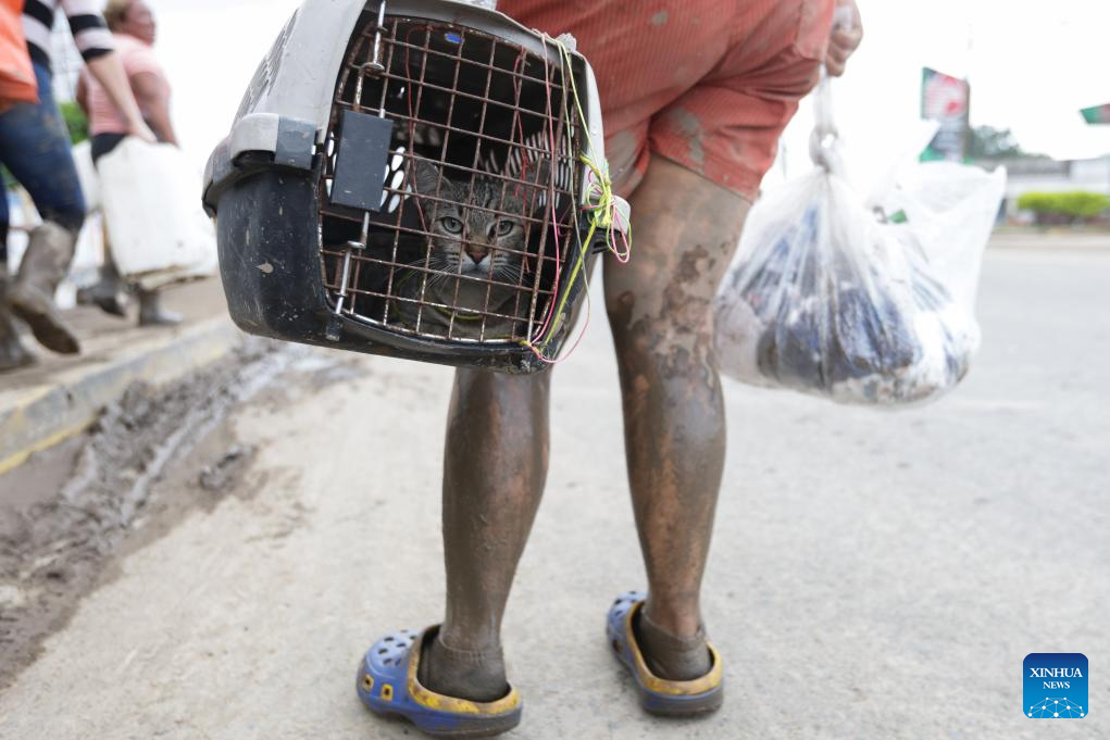 POZA RICA, 11 octubre, 2025 (Xinhua) -- Una persona transporta a un gato después de sufrir afectaciones por las lluvias, en la ciudad de Poza Rica, en el estado de Veracruz, México, el 11 de octubre de 2025. A 37 subió el número de muertos por las intensas lluvias registradas en los últimos días en el centro y oriente de México, informó el sábado la gubernamental Coordinación Nacional de Protección Civil. (Xinhua/Francisco Cañedo)