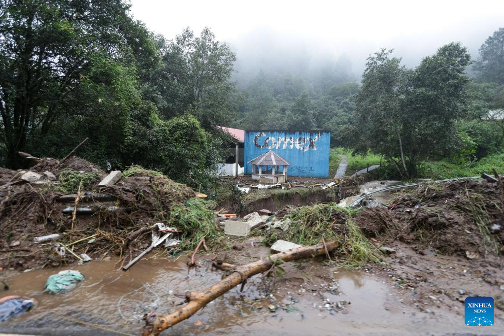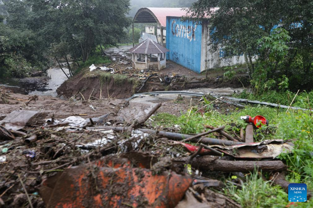 HUAUCHINANGO, 11 octubre, 2025 (Xinhua) -- Imagen del 11 de octubre de 2025 del cierre parcial de una carretera afectada por las lluvias, en Huauchinango, en el estado de Puebla, México. A 37 subió el número de muertos por las intensas lluvias registradas en los últimos días en el centro y oriente de México, informó el sábado la gubernamental Coordinación Nacional de Protección Civil. (Xinhua/Francisco Cañedo)