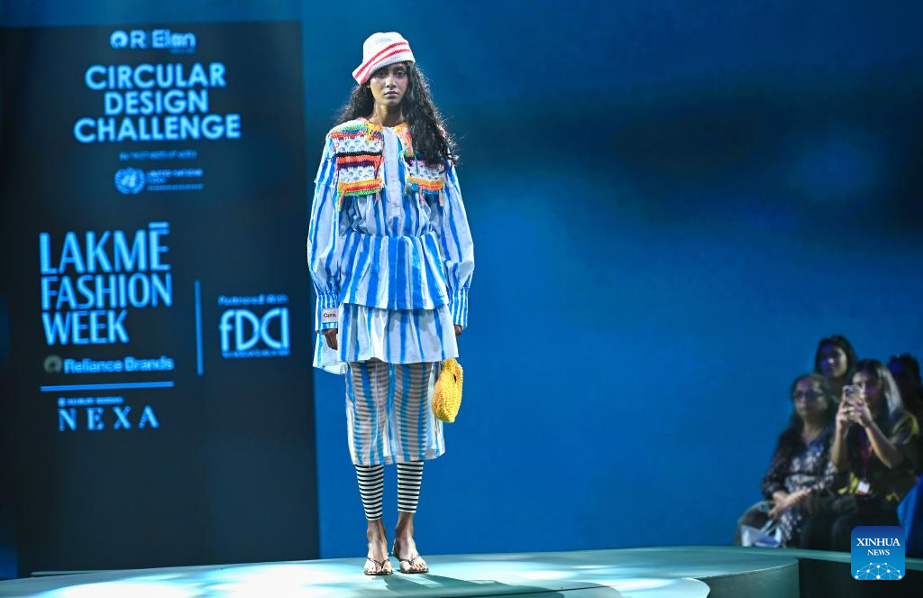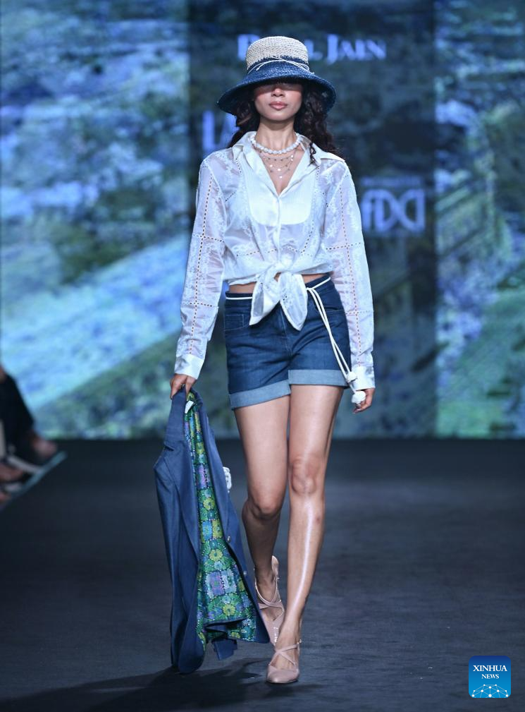 NUEVA DELHI, 11 octubre, 2025 (Xinhua) -- Imagen del 10 de octubre de 2025 de una modelo presentando una creación de la diseñadora italiana Martina Boero durante la Semana de la Moda Lakme x FDCI, en Nueva Delhi, India. (Xinhua/Javed Dar)
