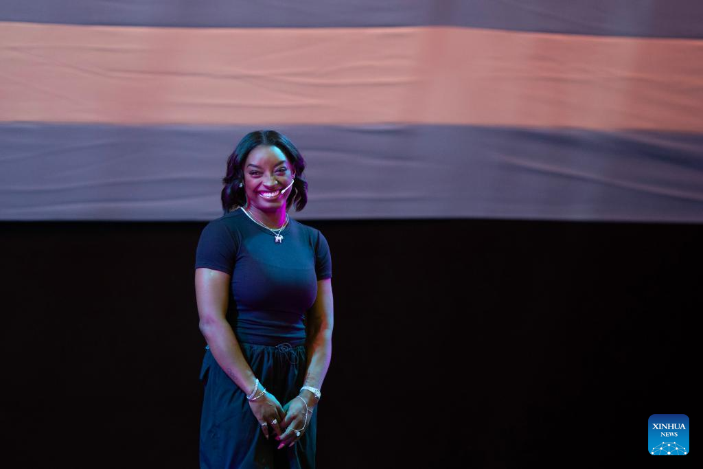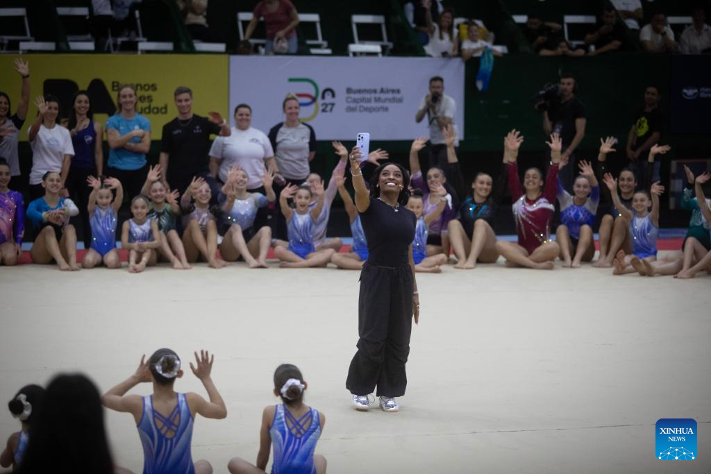 BUENOS AIRES, 10 octubre, 2025 (Xinhua) -- Imagen del 9 de octubre de 2025 de la gimnasta estadounidense, Simone Biles, participando durante una clínica de gimnasia en el estadio Mary Terán de Weiss, en la ciudad de Buenos Aires, capital de Argentina. (Xinhua/Martín Zabala)