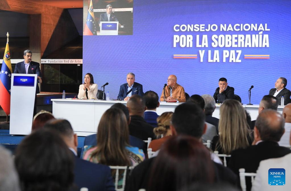 Imagen proveída por la Presidencia de Venezuela del presidente venezolano Nicolás Maduro (i), participando durante una reunión del Consejo Nacional por la Soberanía y la Paz, en Caracas, Venezuela, el 15 de octubre de 2025. Maduro calificó el miércoles como un "éxito absoluto" la activación y el cumplimiento de las tareas en las Zonas Operativas de Defensa Integral, para el fortalecimiento de la soberanía nacional. (Xinhua/Presidencia de Venezuela)