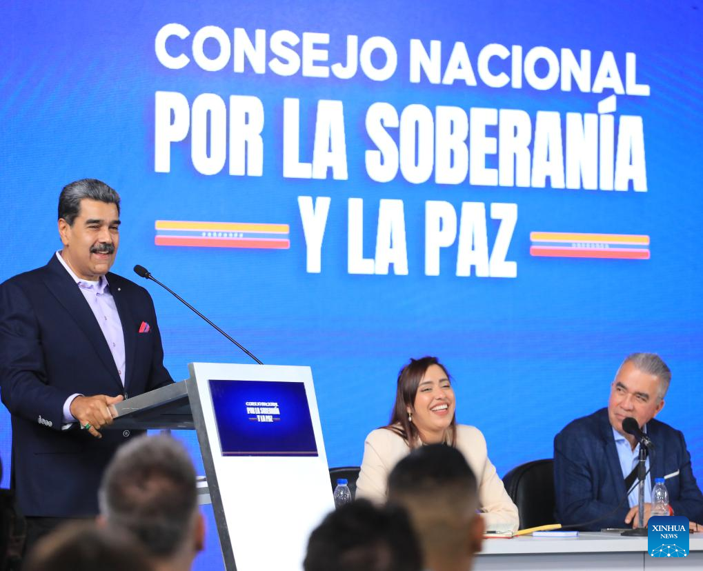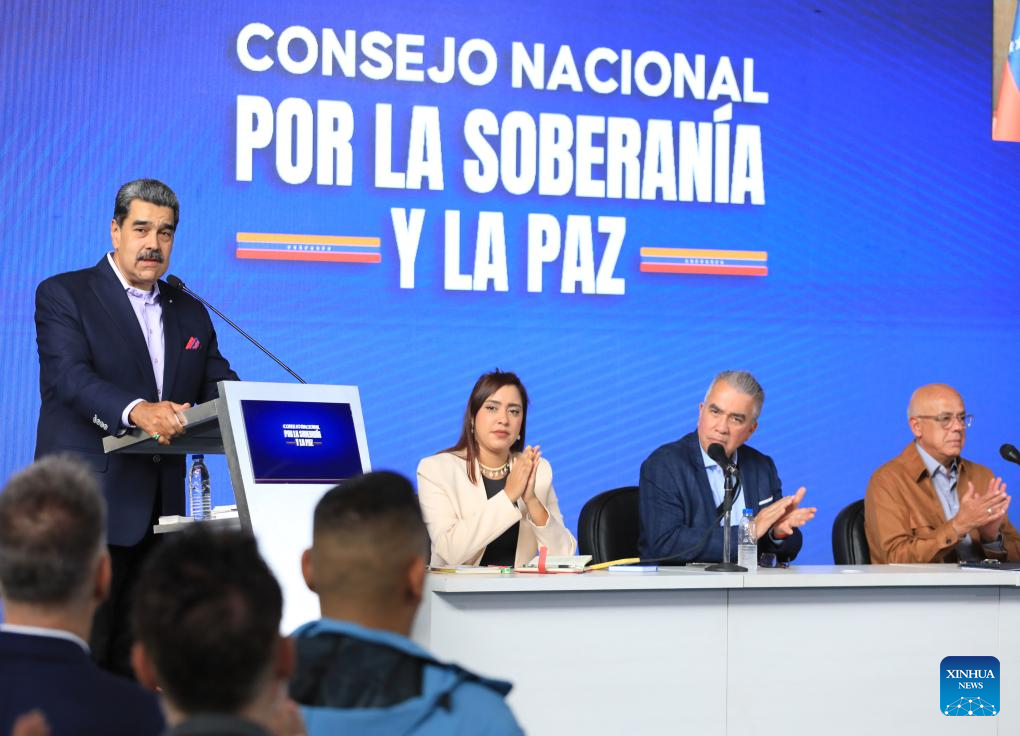 Imagen proveída por la Presidencia de Venezuela del presidente venezolano Nicolás Maduro (i), hablando durante una reunión del Consejo Nacional por la Soberanía y la Paz, en Caracas, Venezuela, el 15 de octubre de 2025. Maduro calificó el miércoles como un "éxito absoluto" la activación y el cumplimiento de las tareas en las Zonas Operativas de Defensa Integral, para el fortalecimiento de la soberanía nacional. (Xinhua/Presidencia de Venezuela)