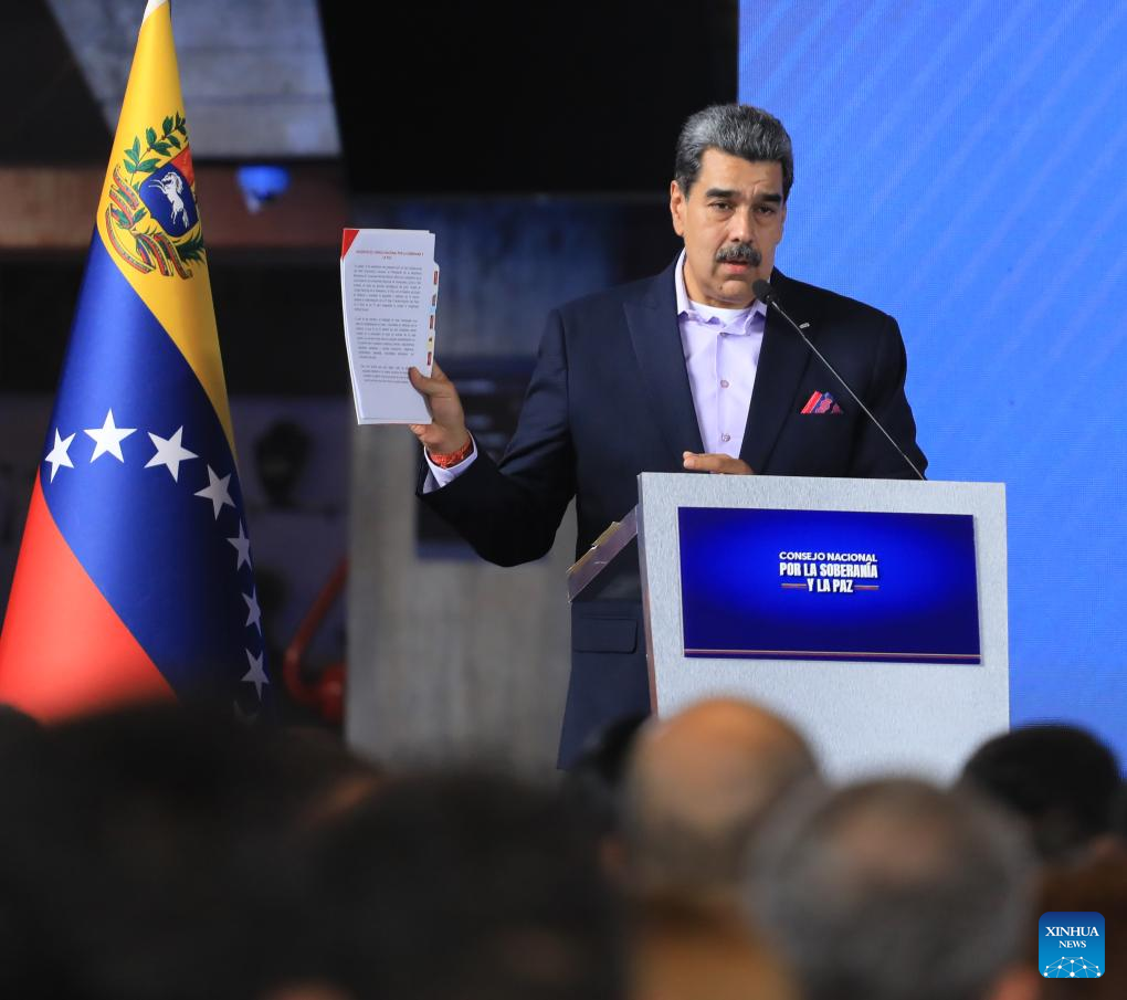 Imagen proveída por la Presidencia de Venezuela del presidente venezolano, Nicolás Maduro, hablando durante una reunión del Consejo Nacional por la Soberanía y la Paz, en Caracas, Venezuela, el 15 de octubre de 2025. Maduro calificó el miércoles como un "éxito absoluto" la activación y el cumplimiento de las tareas en las Zonas Operativas de Defensa Integral, para el fortalecimiento de la soberanía nacional. (Xinhua/Presidencia de Venezuela)