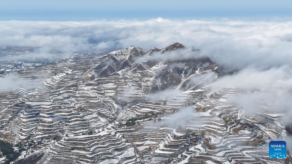 BEIJING, 18 octubre, 2025 (Xinhua) -- Vista aérea tomada con un dron el 17 de octubre de 2025 de campos en terrazas cubiertos de nieve, en el poblado de Chenjing, en el condado de Yongjing, en la provincia de Gansu, en el noroeste de China. (Xinhua/Shi Youdong)